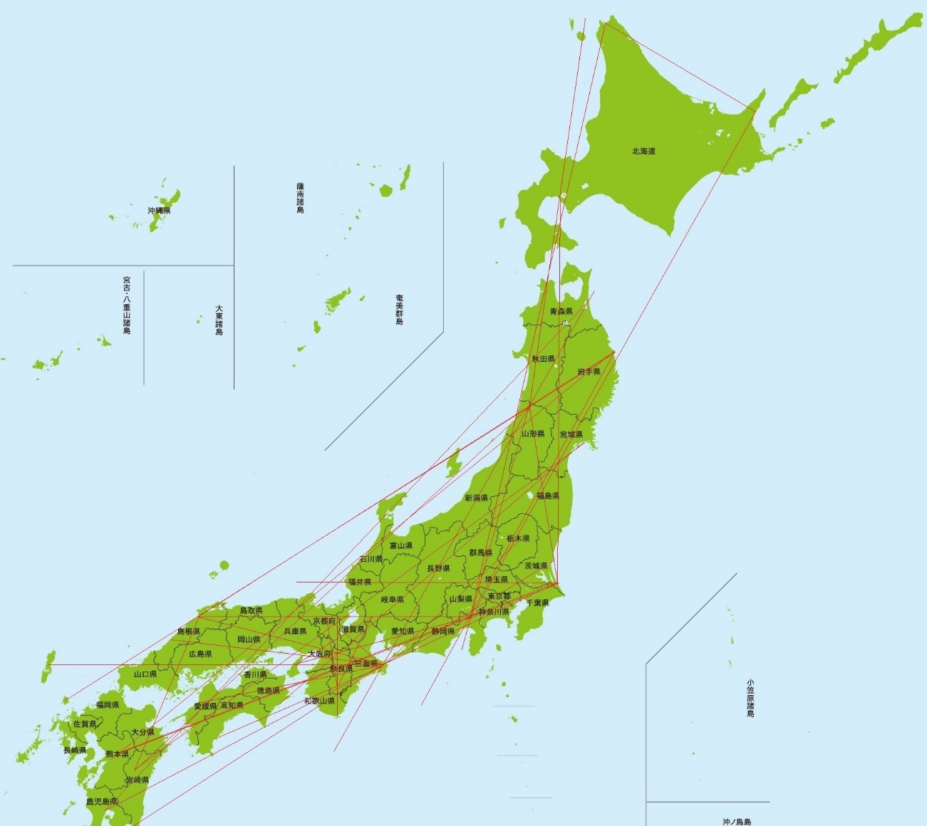 まずは日本全国にあるレイラインをざっくりではありますが引いてみました。
