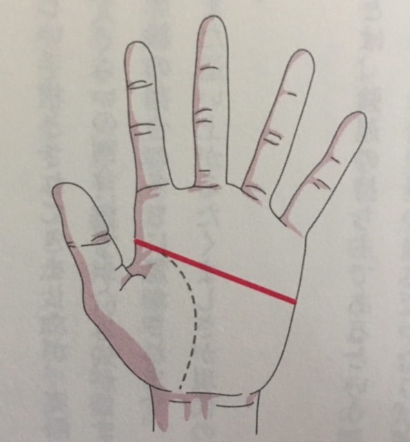知能線と感情線が一つに合致して手のひらを横切り、ちょうどひらがなの「て」の字を書いた形をした線を「マスカケ線」と言います。