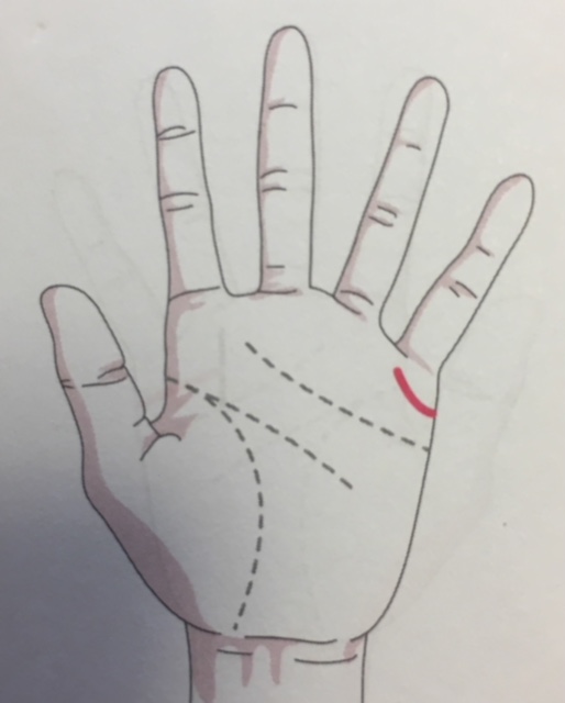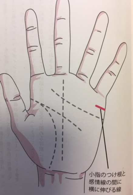 「結婚線」とは、小指のつけ根の線と小指の少し下のあたりから手のひらの上部を横切る形で人さし指方面に向かう「感情線」との間(約3cmぐらいの範囲)に出る短めの線を言います。