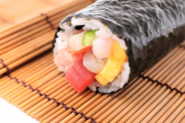巻き寿司を切らずに丸々一本食べるのは「縁を切らない」という意味が込められています。