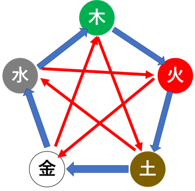 次に図の赤い矢印で結ばれた関係は「相剋」といい、「相性が悪い」とされています。