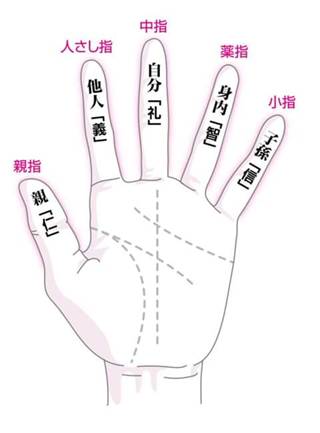 親指は親、人さし指は他人、中指は自分、薬指は身内、小指は子孫というように5つの関係性をそれぞれ示しています。