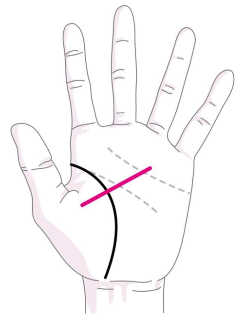 感情線付近から生命線に向けて斜めに流れ、生命線を横切る線を「恋愛線」と言います。恋愛線からは、運命の人との出会い、恋愛スタート、結婚の時期(年齢)を知ることができます。