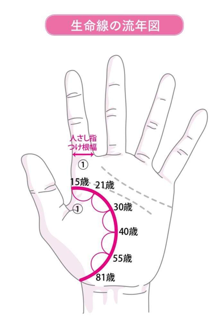 生命線から見る時期の見つけ方は、人さし指の付け根の幅①の長さを測り、その幅①の長さを生命線上に置き換えます。生命線の起点(15歳を表す)から、幅①の長さを等間隔に取っていき、最初の点が21歳、続いて30歳、40歳、55歳、81歳を示しますので、どこに恋愛線が通っているかを確認し参考にしてみて下さいね。