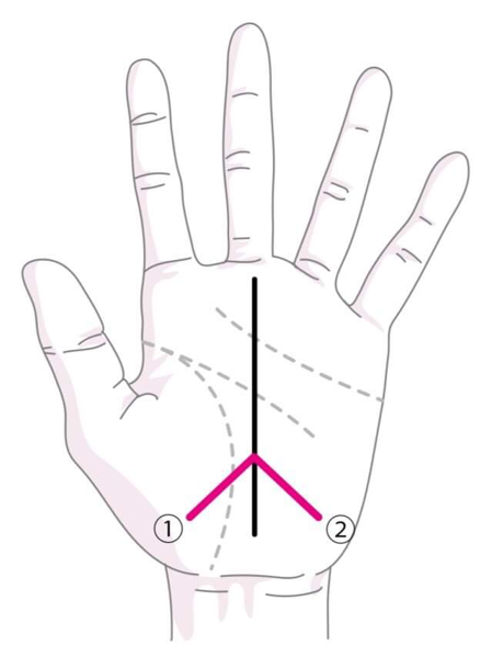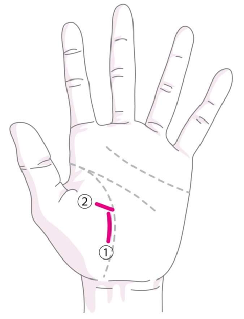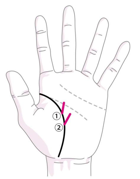 ①の様に生命線に沿ったパートナー線の場合、線が出始める時期に結婚など愛情生活が始まりその後も幸せが長く続くことを意味します。