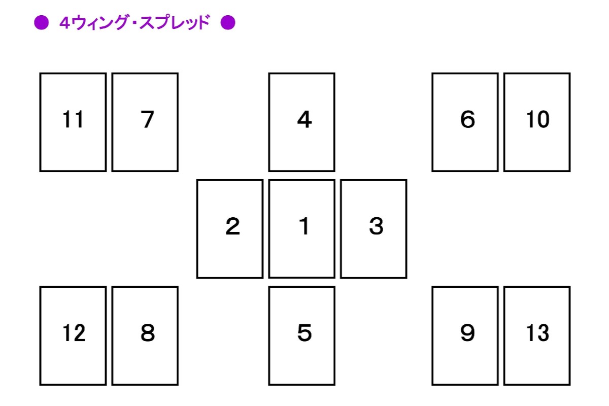 使用した展開法は、「4(フォー)ウィング・スプレッド」という、このまま流れに任せて進んだ時と積極策をもっと講じた場合の両面をみる少し特殊なものです。