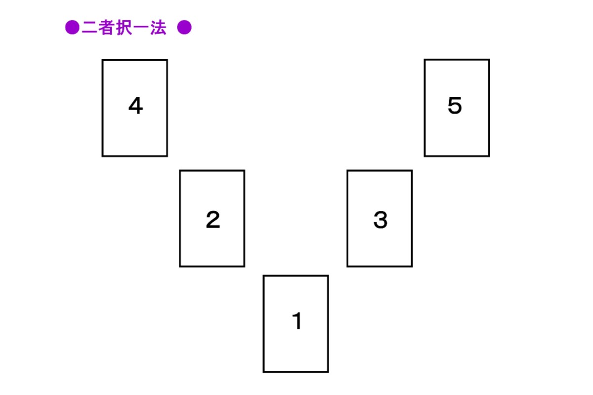 ※数字の順番通りにカードを展開してまず1のカードをよんだ後、左側と右側のラインのカードをそれぞれ纏めてリーディングします。(1→2→4→3→5の順)