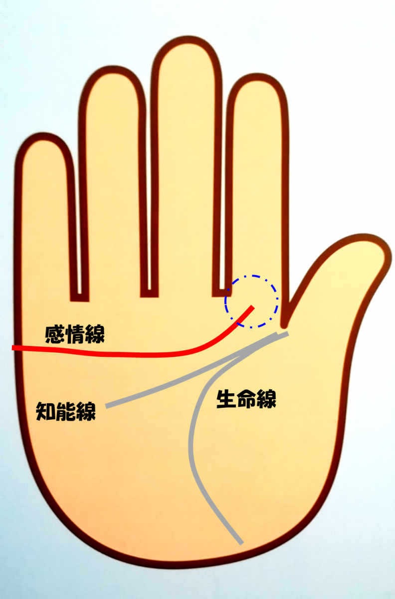 人差し指と中指の間にまで感情線が到達していないタイプ。