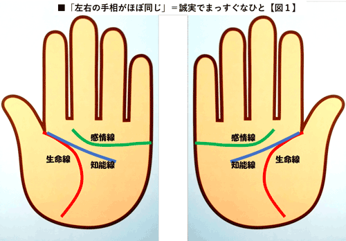 でも、左右とも【図1】のように 生命線・感情線・知能線があれば「左右の手相がほぼ同じ パターン」です。 「左右の手相がほぼ同じ」ひとは、ひとつだけの性質を持つ ので、器用に「相手に合わせて調子よく」ということ が苦手な方が多いようです。 物事にじっくり取り込むのでどちらかというと大器晩成型。 でも、誠実でまっすぐなひとなんです。