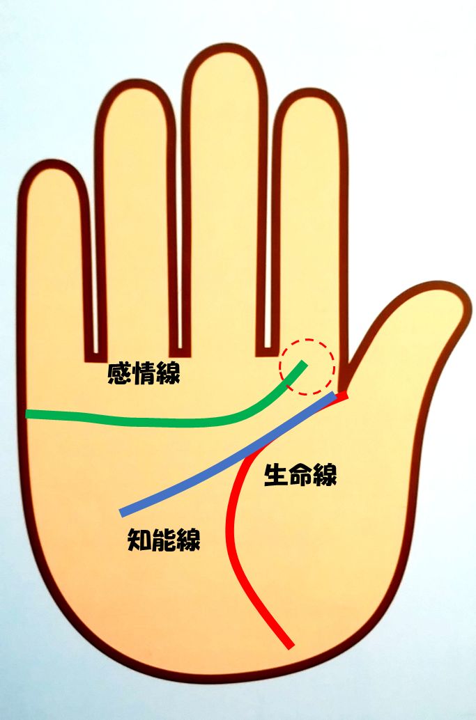 図のように、人差し指の根本にグッと感情線が届いているひとは「思い込んだら命がけ」の情熱的なひとです。